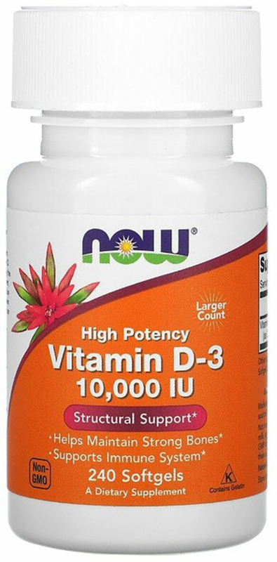 NOW Vitamin D-3 – добавка, содержащая легко усваиваемую форму витамина Д3 (холекальциферола). Потребность в ней возникает при высоких физических нагрузках, зимнее время и возрасте старше 40 лет. В каждой капсуле содержится 250 мкг витамина Д.
